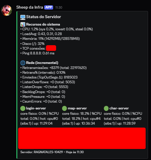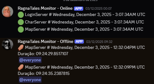 - Bots de Alarme no Discord: Eles funcionam como nossos "alertas de emergência" de primeira linha. Configurados para reportar instantaneamente qualquer anomalia crítica, garantem que a equipe responsável seja notificada imediatamente sobre falhas de conectividade, saturação de disco ou crashes de aplicação, permitindo uma resposta em minutos.