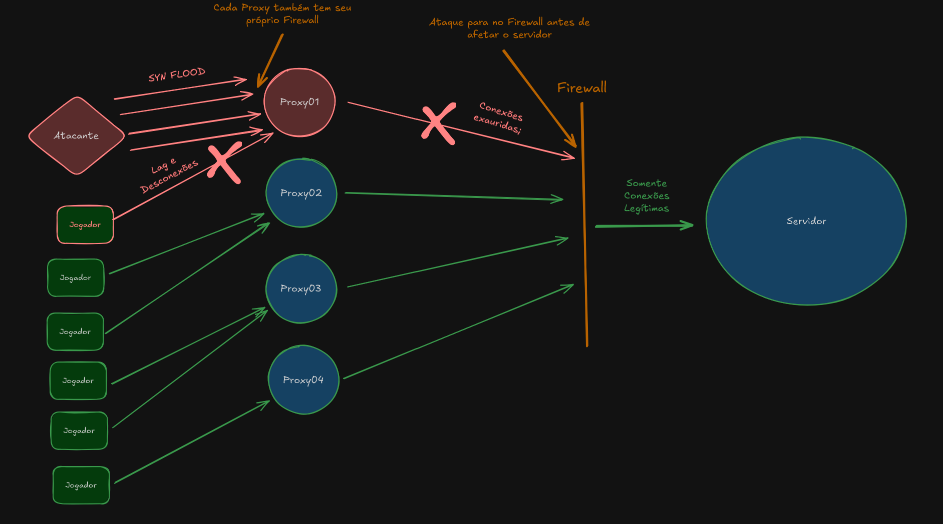 Nós projetamos os proxies para serem descartáveis em caso de ataque. Embora possuam seus próprios firewalls, eles são máquinas com recursos menos potentes que o servidor de jogo.